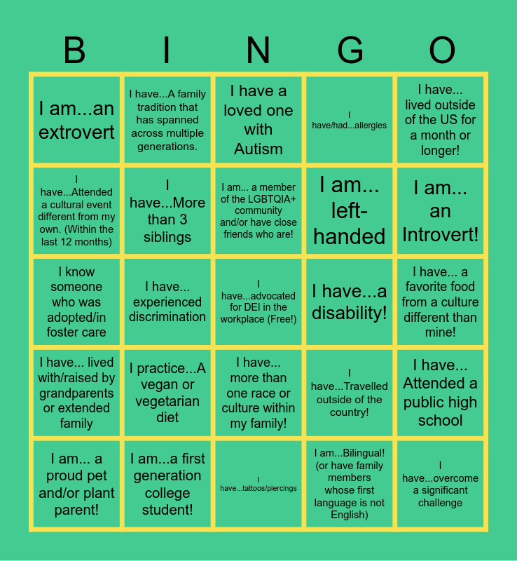 This bingo card has a free space and 24 words: I practice...A vegan or vegetarian diet, I am...a first generation college student!, I am... a member of the LGBTQIA+ community and/or have close friends who are!, I am... a proud pet and/or plant parent!, I have... lived outside of the US for a month or longer!, I am...an extrovert, I have...Attended a cultural event different from my own. (Within the last 12 months), I have...A family tradition that has spanned across multiple generations., I have...a disability!, I have... more than one race or culture within my family!, I am... left-handed, I know someone who was adopted/in foster care, I have...Travelled outside of the country!, I have... Attended a public high school, I have...More than 3 siblings, I am...Bilingual! (or have family members whose first language is not English), I have... a favorite food from a culture different than mine!, I have a loved one with Autism, I am... an Introvert!, I have... experienced discrimination, I have...overcome a significant challenge, I have... lived with/raised by grandparents or extended family, I have/had...allergies and I have...tattoos/piercings.