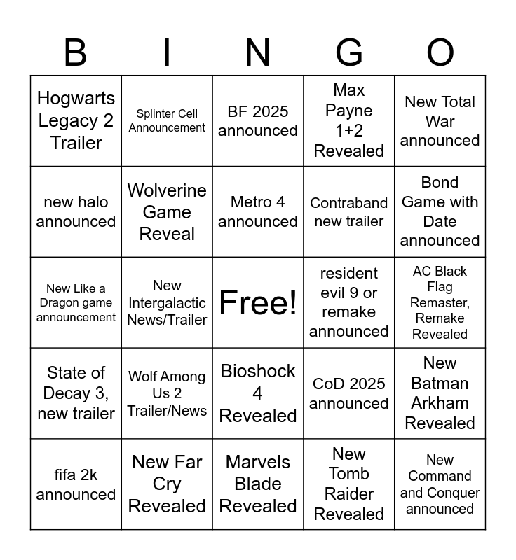 This bingo card has a free space and 24 words: Wolf Among Us 2 Trailer/News, New Far Cry Revealed, Metro 4 announced, fifa 2k announced, New Total War announced, Hogwarts Legacy 2 Trailer, new halo announced, Splinter Cell Announcement, resident evil 9 or remake announced, Bioshock 4 Revealed, Contraband new trailer, New Like a Dragon game announcement, CoD 2025 announced, New Batman Arkham Revealed, Wolverine Game Reveal, New Tomb Raider Revealed, AC Black Flag Remaster, Remake Revealed, BF 2025 announced, Bond Game with Date announced, New Intergalactic News/Trailer, New Command and Conquer announced, State of Decay 3, new trailer, Max Payne 1+2 Revealed and Marvels Blade Revealed.