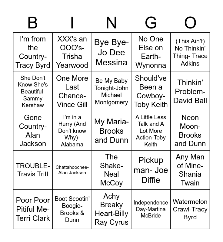 This bingo card has a free space and 28 words: Any Man of Mine-Shania Twain, I Like it, I Love it-Tim McGraw, Should've Been a Cowboy-Toby Keith, Independence Day-Martina McBride, She Don't Know She's Beautiful-Sammy Kershaw, Bye Bye- Jo Dee Messina, XXX's an OOO's-Trisha Yearwood, TROUBLE-Travis Tritt, A Little Less Talk and A Lot More Action-Toby Keith, Poor Poor Pitiful Me-Terri Clark, Gone Country-Alan Jackson, No One Else on Earth-Wynonna, Boot Scootin' Boogie-Brooks & Dunn, Achy Breaky Heart-Billy Ray Cyrus, Thinkin' Problem-David Ball, She Thinks My Tractor's Sexy-Kenny Chesney, Chattahoochee-Alan Jackson, One More Last Chance-Vince Gill, Be My Baby Tonight-John Michael Montgomery, The Shake-Neal McCoy, I'm from the Country-Tracy Byrd, Bubba Shot the Jukebox-Mark Chesnutt, Watermelon Crawl-Tracy Byrd, I'm in a Hurry (And Don't know Why)- Alabama, Neon Moon-Brooks and Dunn, Pickup man- Joe Diffie, (This Ain't) No Thinkin' Thing- Trace Adkins and That's My Story-Collin Raye.