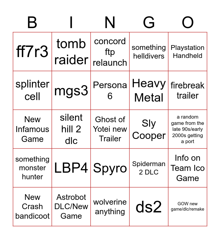This bingo card has a free space and 24 words: LBP4, Astrobot DLC/New Game, Persona 6, New Crash bandicoot, Playstation Handheld, ff7r3, splinter cell, tomb raider, Sly Cooper, Spyro, Heavy Metal, New Infamous Game, Spiderman 2 DLC, Info on Team Ico Game, mgs3, ds2, a random game from the late 90s/early 2000s getting a port, concord ftp relaunch, firebreak trailer, silent hill 2 dlc, GOW new game/dlc/remake, something monster hunter, something helldivers and wolverine anything.