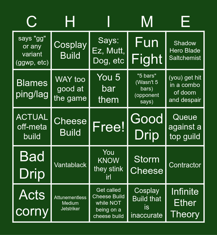 This bingo card has a free space and 24 words: Vantablack, Attunementless Medium Jetstriker, You 5 bar them, Acts corny, Shadow Hero Blade Saltchemist, says "gg" or any variant (ggwp, etc), Blames ping/lag, Cosplay Build, Good Drip, You KNOW they stink irl, "5 bars" (Wasn't 5 bars) (opponent says), ACTUAL off-meta build, Storm Cheese, Contractor, WAY too good at the game, Cosplay Build that is inaccurate, Queue against a top guild, Says: Ez, Mutt, Dog, etc, (you) get hit in a combo of doom and despair, Cheese Build, Infinite Ether Theory, Bad Drip, Fun Fight and Get called Cheese Build while NOT being on a cheese build.