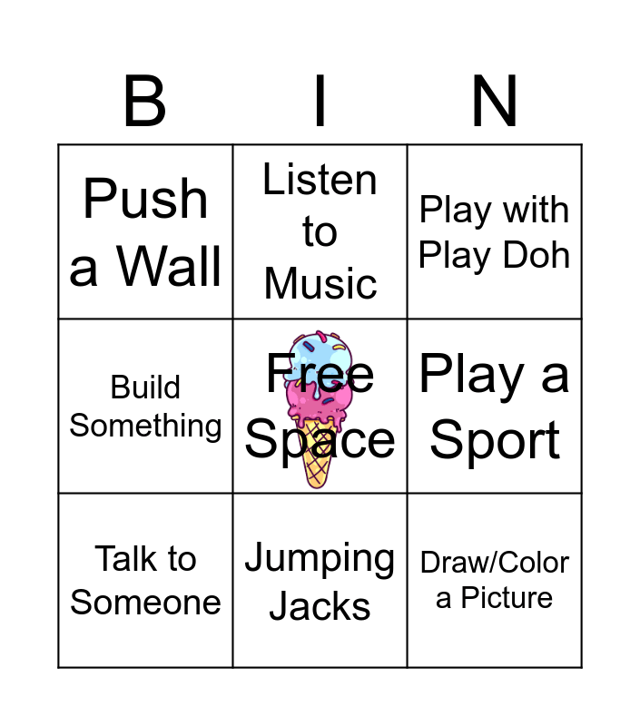 This bingo card has a free space and 11 words: Take a Deep Breath, Jumping Jacks, Draw/Color a Picture, Talk to Someone, Listen to Music, Play with Play Doh, Play a Sport, Take a Nap, Build Something, Push a Wall and Take a Quiet Break.