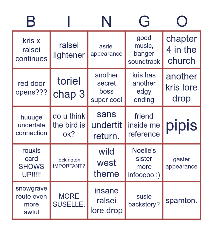 This bingo card has a free space and 24 words: jockington IMPORTANT?, MORE SUSELLE., another secret boss super cool, snowgrave route even more awful, chapter 4 in the church, kris x ralsei continues, red door opens???, ralsei lightener, friend inside me reference, wild west theme, kris has another edgy ending, huuuge undertale connection, Noelle's sister more infooooo :), gaster appearance, toriel chap 3, susie backstory?, pipis, asriel appearance, another kris lore drop, do u think the bird is ok?, spamton., rouxls card SHOWS UP!!!!!, good music, banger soundtrack and insane ralsei lore drop.