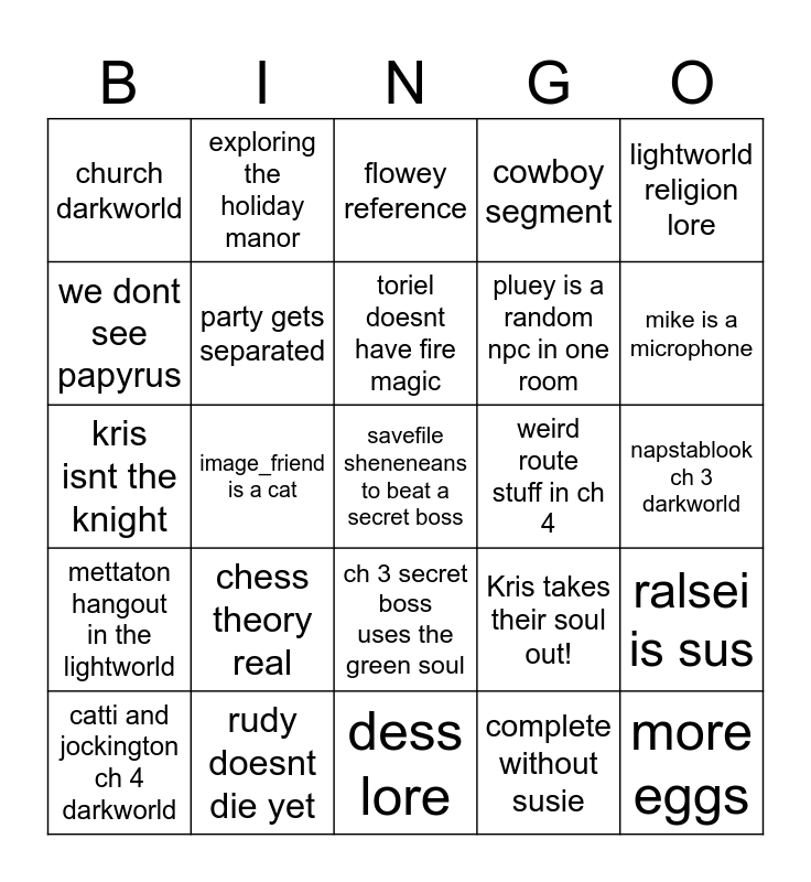This bingo card has 25 words: chess theory real, dess lore, toriel doesnt have fire magic, catti and jockington ch 4 darkworld, lightworld religion lore, church darkworld, we dont see papyrus, exploring the holiday manor, weird route stuff in ch 4, ch 3 secret boss uses the green soul, pluey is a random npc in one room, kris isnt the knight, Kris takes their soul out!, ralsei is sus, party gets separated, more eggs, napstablook ch 3 darkworld, flowey reference, mike is a microphone, image_friend is a cat, savefile sheneneans to beat a secret boss, rudy doesnt die yet, mettaton hangout in the lightworld, cowboy segment and complete without susie.