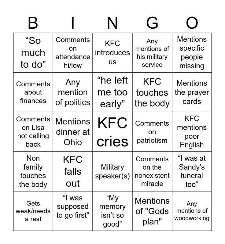 This bingo card has a free space and 24 words: KFC falls out, “I was supposed to go first”, “he left me too early”, Gets weak/needs a rest, Mentions specific people missing, “So much to do”, Comments about finances, Comments on attendance hi/low, Comments on patriotism, Military speaker(s), KFC touches the body, Comments on Lisa not calling back, Comments on the nonexistent miracle, “I was at Sandy’s funeral too”, Any mention of politics, Mentions of "Gods plan", KFC mentions poor English, KFC introduces us, Mentions the prayer cards, Mentions dinner at Ohio, Any mentions of woodworking, Non family touches the body, Any mentions of his military service and “My memory isn’t so good”.