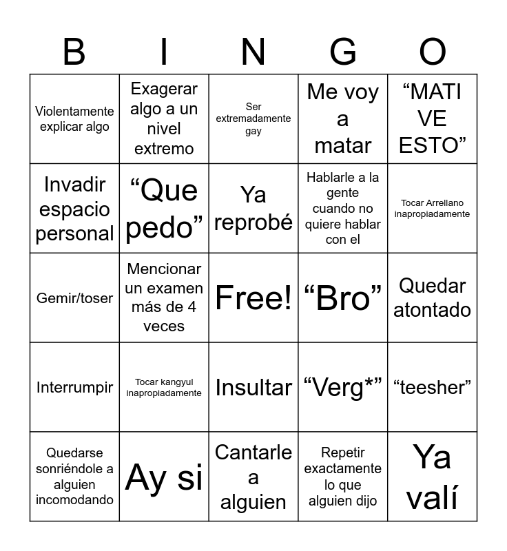 This bingo card has a free space and 24 words: Tocar kangyul inapropiadamente, Ay si, Ya reprobé, Quedarse sonriéndole a alguien incomodando, “MATI VE ESTO”, Violentamente explicar algo, Invadir espacio personal, Exagerar algo a un nivel extremo, “Bro”, Insultar, Hablarle a la gente cuando no quiere hablar con el, Gemir/toser, “Verg*”, “teesher”, “Que pedo”, Repetir exactamente lo que alguien dijo, Quedar atontado, Ser extremadamente gay, Tocar Arrellano inapropiadamente, Mencionar un examen más de 4 veces, Ya valí, Interrumpir, Me voy a matar and Cantarle a alguien.