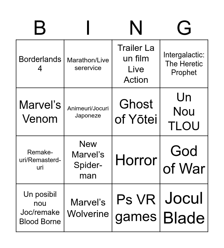 This bingo card has 16 words: Marvel’s Wolverine, God of War, Trailer La un film Live Action, Borderlands 4, Remake-uri/Remasterd-uri, Marathon/Live serervice, Horror, Ps VR games, Marvel’s Venom, Animeuri/Jocuri Japoneze, Un posibil nou Joc/remake Blood Borne, Intergalactic: The Heretic Prophet, New Marvel’s Spider-man, Un Nou TLOU, Ghost of Yōtei and Jocul Blade.