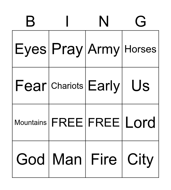 This bingo card has 16 words: God, Man, Army, Horses, Fear, Pray, FREE, Lord, Eyes, Chariots, Fire, Us, Mountains, FREE, Early and City.