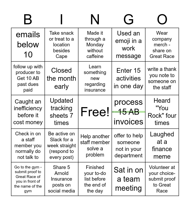This bingo card has 1 images, a free space and 24 words: Be active on Slack for a week straight (respond to every post), Share 5 Arnold Insurance posts on social media, Learn something new regarding insurance, Go to the gym - submit proof to Great Race of you in front of the name of the gym, Wear company merch - share on Great Race, emails below 10, follow up with producer to Get 10 AB past dues paid, Take snack or treat to a location besides Cape, process 15 AB invoices, Help another staff member solve a problem, Enter 15 activities in one day, Caught an inefficiency before it cost money, offer to help someone not in your department, Laughed at a finance meme, Closed the month early, Sat in on a team meeting, Heard "You Rock" four times, Made it through a Monday without caffeine, write a thank you note to someone on the staff, Updated tracking sheets 7 times, Volunteer at your choice- submit proof to Great Race, Check in on a staff member you normally do not talk to, Used an emoji in a work message and Finished your to-do list before the end of the day.