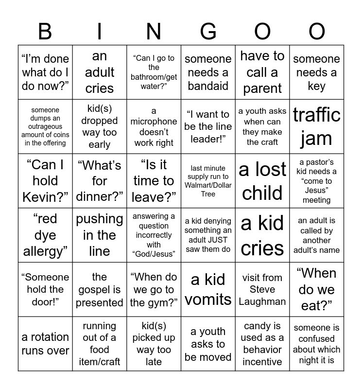 This bingo card has 36 words: a kid vomits, “When do we go to the gym?”, a youth asks to be moved, someone dumps an outrageous amount of coins in the offering, “red dye allergy”, last minute supply run to Walmart/Dollar Tree, kid(s) dropped way too early, kid(s) picked up way too late, have to call a parent, visit from Steve Laughman, traffic jam, someone needs a bandaid, “When do we eat?”, “What’s for dinner?”, “I want to be the line leader!”, “I’m done what do I do now?”, “Someone hold the door!”, a lost child, “Can I hold Kevin?”, “Can I go to the bathroom/get water?”, “Is it time to leave?”, pushing in the line, a kid denying something an adult JUST saw them do, answering a question incorrectly with “God/Jesus”, a kid cries, an adult cries, a youth asks when can they make the craft, running out of a food item/craft, a microphone doesn’t work right, someone needs a key, someone is confused about which night it is, a rotation runs over, an adult is called by another adult’s name, a pastor’s kid needs a “come to Jesus” meeting, the gospel is presented and candy is used as a behavior incentive.