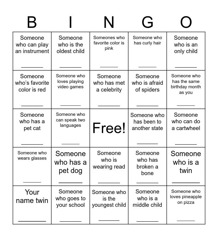 This bingo card has a free space and 24 words: Someone who has a pet dog ______, Someone who goes to your school _______, Someone who has met a celebrity _______, Your name twin _______, Someone who is an only child _______, Someone who can play an instrument _______, Someone who’s favorite color is red _______, Someone who is the oldest child _______, Someone who has been to another state _______, Someone who is wearing read _______, Someone who is afraid of spiders _______, Someone who has a pet cat _______, Someone who has broken a bone _______, Someone who is a twin _______, Someone who loves playing video games ________, Someone who is a middle child _______, Someone who can do a cartwheel _______, Someones who favorite color is pink _______, Someone who has the same birthday month as you _______, Someone who can speak two languages _______, Someone who loves pineapple on pizza _______, Someone who wears glasses _______, Someone who has curly hair _______ and Someone who is the youngest child _______.