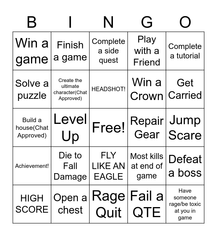 This bingo card has a free space and 24 words: Die to Fall Damage, Open a chest, HEADSHOT!, HIGH SCORE, Complete a tutorial, Win a game, Solve a puzzle, Finish a game, Repair Gear, FLY LIKE AN EAGLE, Win a Crown, Build a house(Chat Approved), Most kills at end of game, Defeat a boss, Create the ultimate character(Chat Approved), Fail a QTE, Jump Scare, Complete a side quest, Get Carried, Level Up, Have someone rage/be toxic at you in game, Achievement!, Play with a Friend and Rage Quit.