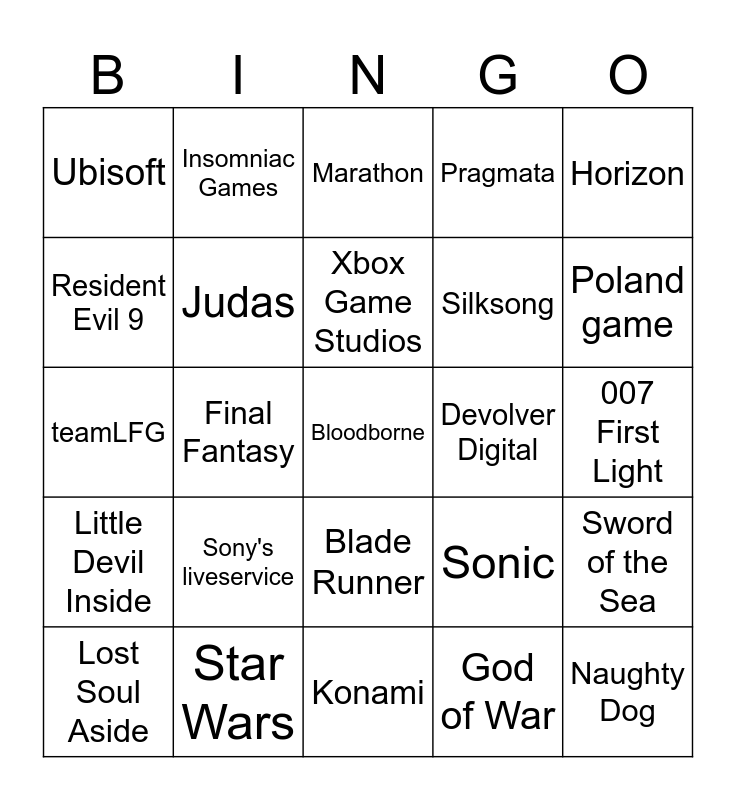 This bingo card has a free space and 24 words: Sony's liveservice, Star Wars, Xbox Game Studios, Lost Soul Aside, Horizon, Ubisoft, Resident Evil 9, Insomniac Games, Devolver Digital, Blade Runner, Silksong, teamLFG, Sonic, Sword of the Sea, Judas, God of War, 007 First Light, Marathon, Poland game, Final Fantasy, Naughty Dog, Little Devil Inside, Pragmata and Konami.