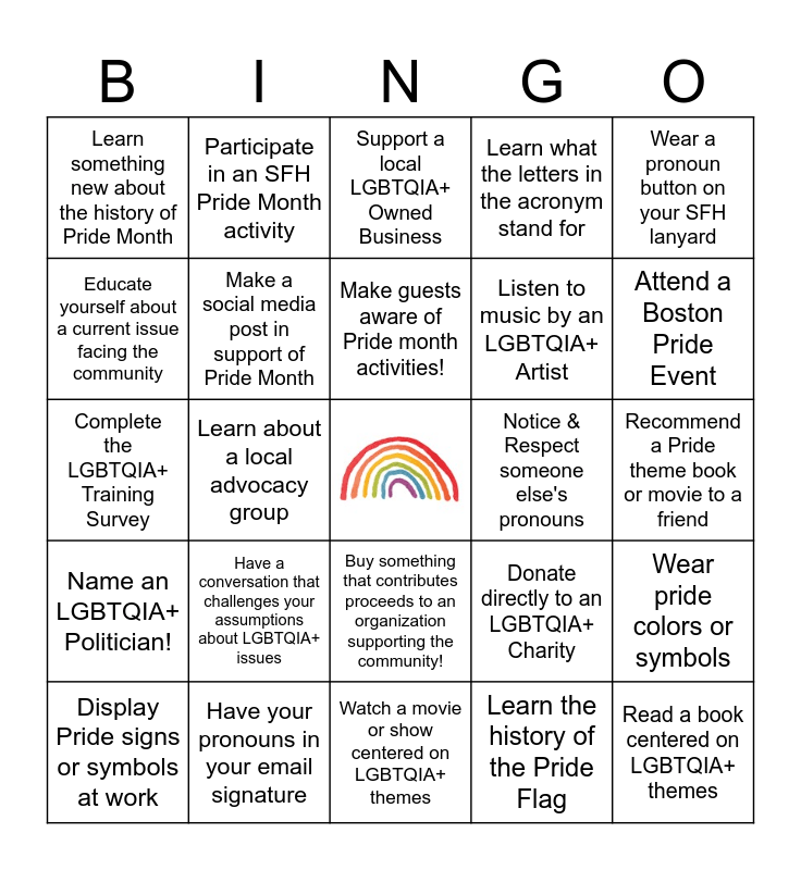 This bingo card has a free space and 24 words: Have a conversation that challenges your assumptions about LGBTQIA+ issues, Have your pronouns in your email signature, Make guests aware of Pride month activities!, Display Pride signs or symbols at work, Wear a pronoun button on your SFH lanyard, Learn something new about the history of Pride Month, Educate yourself about a current issue facing the community, Participate in an SFH Pride Month activity, Notice & Respect someone else's pronouns, Buy something that contributes proceeds to an organization supporting the community!, Listen to music by an LGBTQIA+ Artist, Complete the LGBTQIA+ Training Survey, Donate directly to an LGBTQIA+ Charity, Wear pride colors or symbols, Make a social media post in support of Pride Month, Learn the history of the Pride Flag, Recommend a Pride theme book or movie to a friend, Support a local LGBTQIA+ Owned Business, Attend a Boston Pride Event, Learn about a local advocacy group, Read a book centered on LGBTQIA+ themes, Name an LGBTQIA+ Politician!, Learn what the letters in the acronym stand for and Watch a movie or show centered on LGBTQIA+ themes.