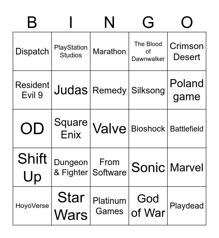 This bingo card has a free space and 24 words: Dungeon & Fighter, Star Wars, Remedy, HoyoVerse, Crimson Desert, Dispatch, Resident Evil 9, PlayStation Studios, Bioshock, From Software, Silksong, OD, Sonic, Marvel, Judas, God of War, Battlefield, Marathon, Poland game, Square Enix, Playdead, Shift Up, The Blood of Dawnwalker and Platinum Games.