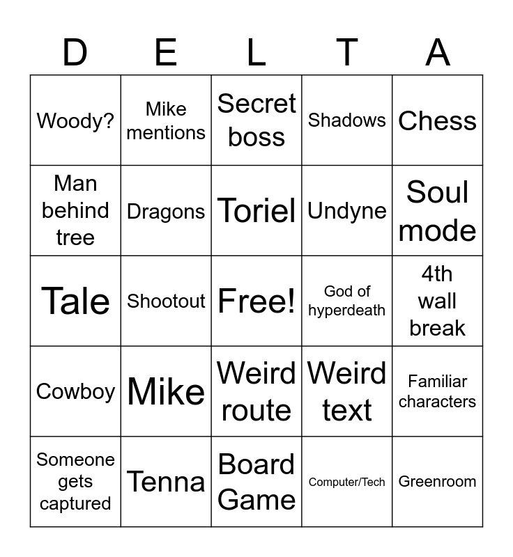 This bingo card has a free space and 24 words: Mike, Tenna, Toriel, Someone gets captured, Chess, Woody?, Man behind tree, Mike mentions, God of hyperdeath, Weird route, Undyne, Tale, Weird text, Familiar characters, Dragons, Computer/Tech, 4th wall break, Secret boss, Soul mode, Shootout, Greenroom, Cowboy, Shadows and Board Game.
