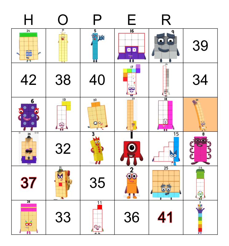 This bingo card has 30 images and 13 words: 31, 32, 33, 34, 35, 36, 37, 38, 39, 40, 41, 42 and 43.