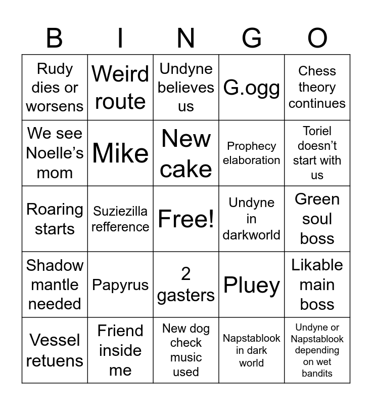 This bingo card has a free space and 24 words: Papyrus, Friend inside me, New cake, Vessel retuens, Chess theory continues, Rudy dies or worsens, We see Noelle’s mom, Weird route, Undyne in darkworld, 2 gasters, Prophecy elaboration, Roaring starts, Pluey, Likable main boss, Mike, Napstablook in dark world, Green soul boss, Undyne believes us, Toriel doesn’t start with us, Suziezilla refference, Undyne or Napstablook depending on wet bandits, Shadow mantle needed, G.ogg and New dog check music used.