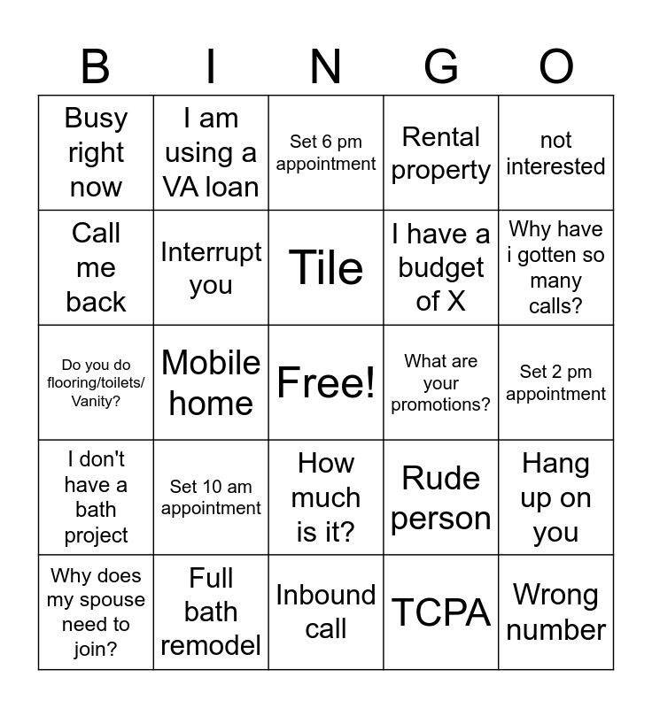 This bingo card has a free space and 24 words: Set 10 am appointment, Full bath remodel, Tile, Why does my spouse need to join?, not interested, Busy right now, Call me back, I am using a VA loan, What are your promotions?, How much is it?, I have a budget of X, Do you do flooring/toilets/ Vanity?, Rude person, Hang up on you, Interrupt you, TCPA, Set 2 pm appointment, Set 6 pm appointment, Why have i gotten so many calls?, Mobile home, Wrong number, I don't have a bath project, Rental property and Inbound call.