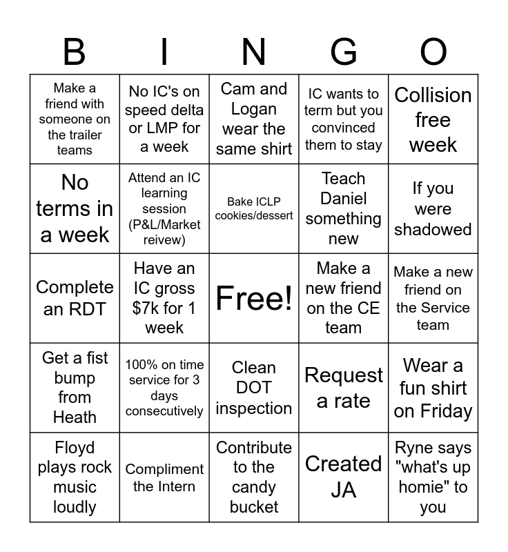 This bingo card has a free space and 24 words: 100% on time service for 3 days consecutively, Compliment the Intern, Bake ICLP cookies/dessert, Floyd plays rock music loudly, Collision free week, Make a friend with someone on the trailer teams, No terms in a week, No IC's on speed delta or LMP for a week, Make a new friend on the CE team, Clean DOT inspection, Teach Daniel something new, Complete an RDT, Request a rate, Wear a fun shirt on Friday, Attend an IC learning session (P&L/Market reivew), Created JA, Make a new friend on the Service team, Cam and Logan wear the same shirt, If you were shadowed, Have an IC gross $7k for 1 week, Ryne says "what's up homie" to you, Get a fist bump from Heath, IC wants to term but you convinced them to stay and Contribute to the candy bucket.
