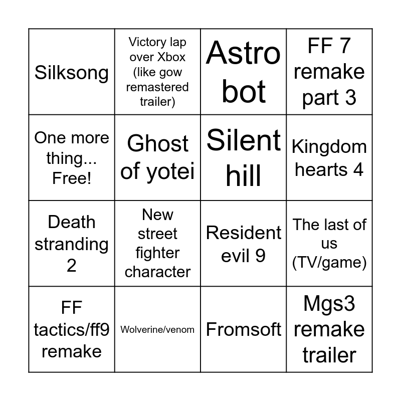 This bingo card has 16 words: Wolverine/venom, The last of us (TV/game), Astro bot, Silksong, Death stranding 2, Victory lap over Xbox (like gow remastered trailer), Resident evil 9, Fromsoft, One more thing... Free!, Ghost of yotei, FF tactics/ff9 remake, FF 7 remake part 3, New street fighter character, Kingdom hearts 4, Silent hill and Mgs3 remake trailer.