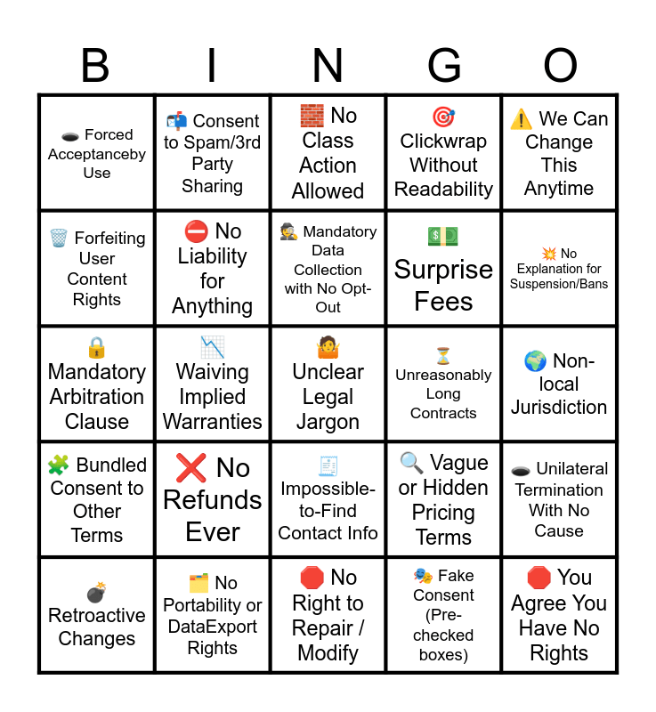 This bingo card has a free space and 24 words: โ No Refunds Ever, ๐๏ธ No Portability or DataExport Rights, ๐ต๏ธ Mandatory Data Collection with No Opt-Out, ๐ฃ Retroactive Changes, โ ๏ธ We Can Change This Anytime, ๐ณ๏ธ Forced Acceptanceby Use, ๐๏ธ Forfeiting User Content Rights, ๐ฌ Consent to Spam/3rd Party Sharing, โณ Unreasonably Long Contracts, ๐งพ Impossible-to-Find Contact Info, ๐ต Surprise Fees, ๐ Mandatory Arbitration Clause, ๐ Vague or Hidden Pricing Terms, ๐ณ๏ธ Unilateral Termination With No Cause, โ No Liability for Anything, ๐ญ Fake Consent (Pre-checked boxes), ๐ Non-local Jurisdiction, ๐งฑ No Class Action Allowed, ๐ฅ No Explanation for Suspension/Bans, ๐ Waiving Implied Warranties, ๐ You Agree You Have No Rights, ๐งฉ Bundled Consent to Other Terms, ๐ฏ Clickwrap Without Readability and ๐ No Right to Repair / Modify.
