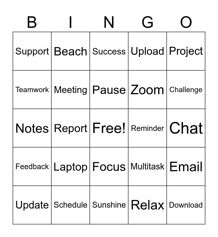 This bingo card has a free space and 37 words: Deadline, Break, Coffee, Meeting, Email, Laptop, Pause, Goal, Project, Task, Report, Upload, Download, Chat, Teamwork, Feedback, Productivity, Success, Focus, Reminder, Support, Challenge, Update, Sunshine, Vacation, Relax, Beach, Fun, Cheers, Brainstorm, Sync, Schedule, Notes, Presentation, Multitask, Zoom and Phone.