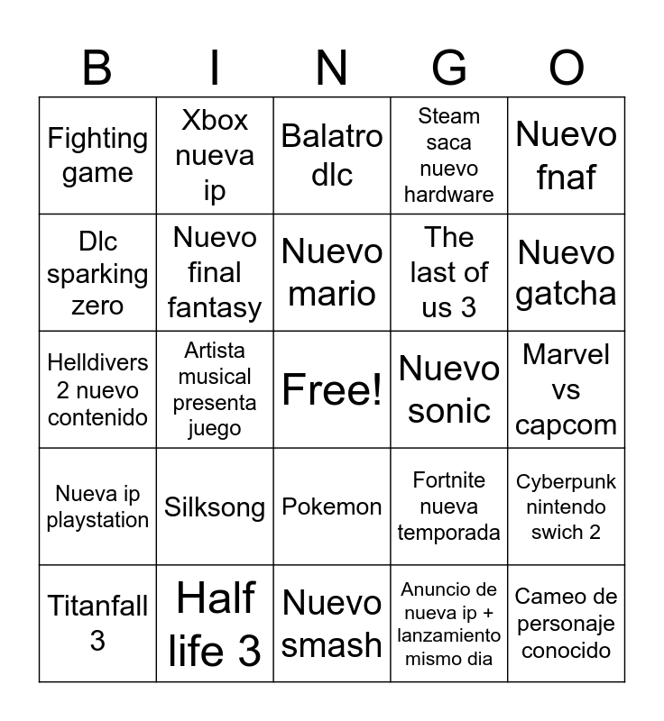 This bingo card has a free space and 24 words: Silksong, Half life 3, Nuevo mario, Titanfall 3, Nuevo fnaf, Fighting game, Dlc sparking zero, Xbox nueva ip, Nuevo sonic, Pokemon, The last of us 3, Helldivers 2 nuevo contenido, Fortnite nueva temporada, Cyberpunk nintendo swich 2, Nuevo final fantasy, Anuncio de nueva ip + lanzamiento mismo dia, Marvel vs capcom, Balatro dlc, Nuevo gatcha, Artista musical presenta juego, Cameo de personaje conocido, Nueva ip playstation, Steam saca nuevo hardware and Nuevo smash.