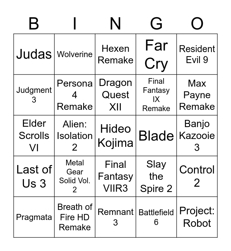 This bingo card has a free space and 24 words: Metal Gear Solid Vol. 2, Breath of Fire HD Remake, Dragon Quest XII, Pragmata, Resident Evil 9, Judas, Judgment 3, Wolverine, Blade, Final Fantasy VIIR3, Final Fantasy IX Remake, Elder Scrolls VI, Slay the Spire 2, Control 2, Persona 4 Remake, Battlefield 6, Banjo Kazooie 3, Hexen Remake, Max Payne Remake, Alien: Isolation 2, Project: Robot, Last of Us 3, Far Cry and Remnant 3.