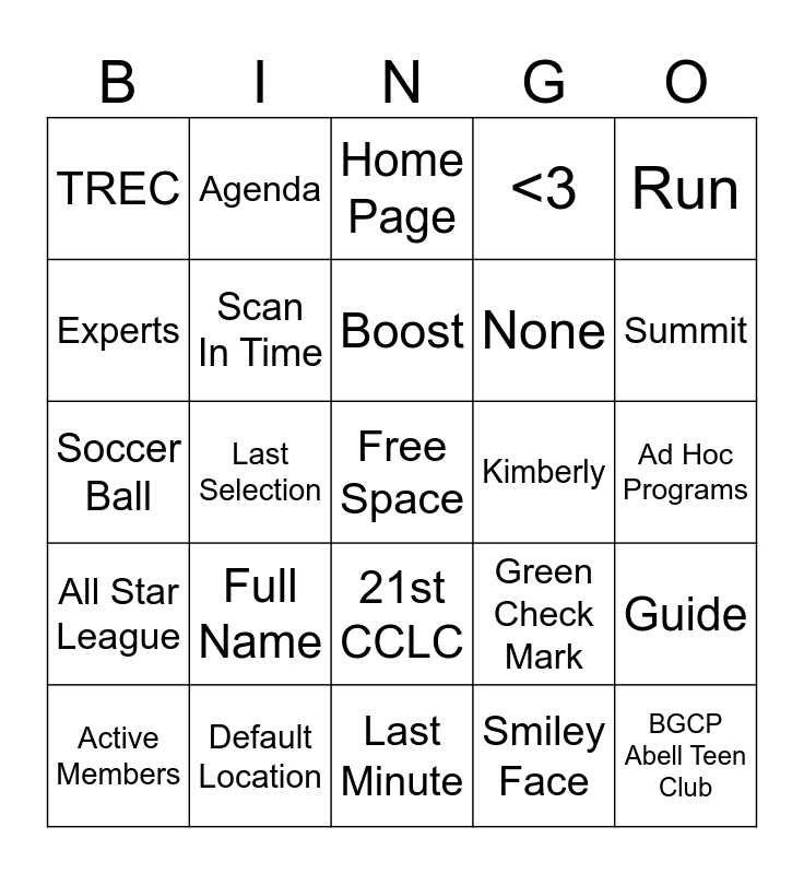 This bingo card has a free space and 29 words: Active Members, Finish, Last Selection, 2nd - 3rd Visits, TREC, Home Page, Scan In Time, Full Name, Kimberly, Default Location, Ad Hoc Programs, BGCP Abell Teen Club, Last Minute, Smiley Face, Summit, FDA, 21st CCLC, All Star League, Run, Soccer Ball, Green Check Mark, Primary, None, Experts, <3, Agenda, Guide, Boost and High School Musical Reference.