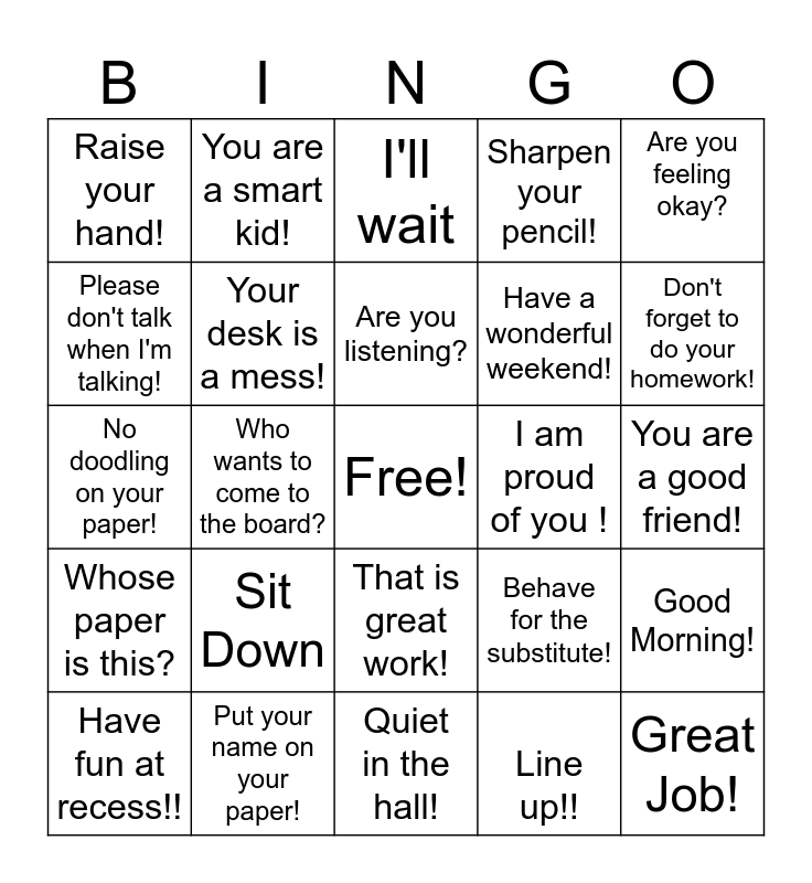 This bingo card has a free space and 24 words: Sit Down, Put your name on your paper!, Are you listening?, Have fun at recess!!, Are you feeling okay?, Raise your hand!, Please don't talk when I'm talking!, You are a smart kid!, I am proud of you !, That is great work!, Have a wonderful weekend!, No doodling on your paper!, Behave for the substitute!, Good Morning!, Your desk is a mess!, Line up!!, You are a good friend!, I'll wait, Don't forget to do your homework!, Who wants to come to the board?, Great Job!, Whose paper is this?, Sharpen your pencil! and Quiet in the hall!.