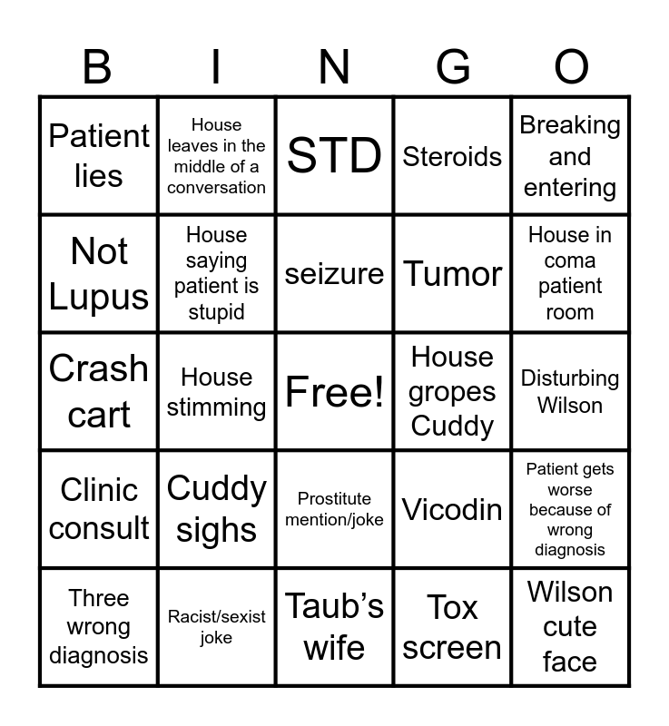 This bingo card has a free space and 24 words: Cuddy sighs, Racist/sexist joke, seizure, Three wrong diagnosis, Breaking and entering, Patient lies, Not Lupus, House leaves in the middle of a conversation, House gropes Cuddy, Prostitute mention/joke, Tumor, Crash cart, Vicodin, Patient gets worse because of wrong diagnosis, House saying patient is stupid, Tox screen, Disturbing Wilson, STD, House in coma patient room, House stimming, Wilson cute face, Clinic consult, Steroids and Taub’s wife.