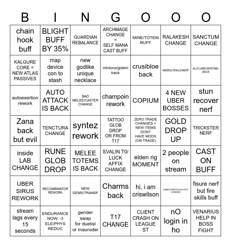 This bingo card has a free space and 48 words: hi, i am criswilson, HB/MOLTEN/LS/NERF, T17 CHANGE, TENCTURA CHANGE, BAD MELEE/CASTER CHANGE, TRICKSTER NERF, BLIGHT BUFF BY 35%, ENDURANCE NOW: -3 ELE/PHYS REDUC, RALAKESH CHANGE, SVALIN T0/ LUCK AFFIX CHANGE, SANCTUM CHANGE, ARCHMAGE CHANGE = SELF MANA CAST BUFF, 4 NEW UBER BOSSES, COPIUM, UBER SIRUS REWORK, GOLD DROP UP, KALGURE CORE = NEW ATLAS PASSIVES, ALLFLAME/SENTINEL BACK, SABOUTER/OCCULTIST CHANGE, MINE/TOTEM BUFF, crusibloe back, syntez rework, chain hook buff, map device con to stash, fisure nerf but fire skills buff, new godlike unique necklace, stun recover nerf, stream lags every 15 seconds, champoin rework, AUTO ATTACK IS BACK, nO login in ho, ZERO TRADE CHANGES + NEW ITEMS DONT HAVE MODS (ON TRADE), CAST ON BUFF, RECOMBINATOR REWORK, Zana back but evil, elden rig MOMENT, 2 people on stream, autoexertion rework, MELEE TOTEMS IS BACK, NEW GEMS/TRANSF, inside LAB CHANGE, VENARIUS HELP IN BOSS FIGHT, GUARDIAN REBALANCE, gender swap for duelist or mauroder, minions/golem back, Charms back, RUNE GLOB DROP and CLIENT CRASH ON LEAGUE ST.