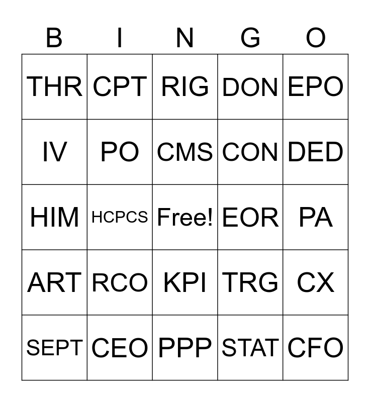 This bingo card has a free space and 134 words: ADJ, ALM, AMA, AP, APL, AR, ART, ASC, ATB, ATOS, AUTH, BAR, BCBS, BOM, CA, CB, CBO, CC, CDHP, CDM, CDO, CEO, CFO, CIF, CLT, CM, CMS, CMS 1500, COB, COINS, CON, CPT, CX, DED, DFO, DIBS, DO, DOB, DOI, DOL, DON, DOS, DX, EBITDA, ECS, EDI, EFT, EOB, EOR, EPO, ERA, ERISA, FAST, FC, FFS, FMLA, FO, G/L, GVP, HCPCS, HIM, HIPAA, HMO, HR, HST, ICD, INS, IT, IUH, IV, IVR, KPI, LMS, LOA, MC, MTD, NCCI, NPI, NPR, NTT, OON, OOP, OWS, PA, PACU, PART, PAS, PCD, PCP, PI, PO, POPP, POS, PPO, PPP, PPRT, PR, PTO, QA, QTD, RCM, RCO, RIG, RCR, RCS, ROI, RVP, RX, SCAH, SCALE, SCO, SE, SEPT, SNF, STAT, SVP, TA, TGS, THR, TOB, TRG, TSC, TX, UAR, UAV, UB-04, UBO, VA, VAL, WC, YOE, YOY, YTD and ZBA.