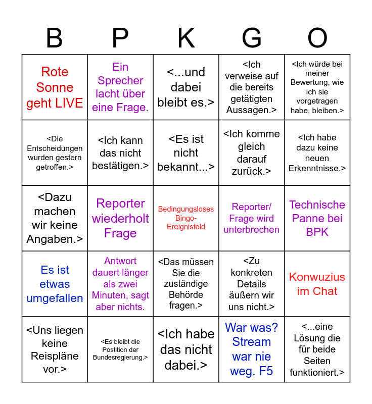 This bingo card has a free space and 35 words: <Das muss dann nachgereicht werden.>, <Das wird intern geprüft.>, <Dazu liegen mir keine Informationen vor.>, <Ich kann das nicht bestätigen.>, <Das müssen Sie die zuständige Behörde fragen.>, <Ich verweise auf die bereits getätigten Aussagen.>, <Die Entscheidungen wurden gestern getroffen.>, <Dazu kann die Politik einen Beitrag leisten.>, <Es ist nicht bekannt...>, <Dem habe ich nichts hinzuzufügen.>, <Dazu machen wir keine Angaben.>, <Ich würde bei meiner Bewertung, wie ich sie vorgetragen habe, bleiben.>, <Es ist immer sehr schwer zu beurteilen.>, 10er Subgifts, Rote Sonne geht LIVE, Reporter/ Frage wird unterbrochen, War was? Stream war nie weg. F5, Reporter wiederholt Frage, Es ist etwas umgefallen, <...eine Lösung die für beide Seiten funktioniert.>, <Zu konkreten Details äußern wir uns nicht.>, <Uns liegen keine Reispläne vor.>, Konwuzius im Chat, <Es bleibt die Postition der Bundesregierung.>, <...und dabei bleibt es.>, <Ich habe dazu keine neuen Erkenntnisse.>, <Wir haben wichtige Weichenstellungen vorgenommen.>, Ein Sprecher wiederholt eine Antwort wortwörtlich., <Ich komme gleich darauf zurück.>, Technische Panne bei BPK, <Ich kann Ihnen das nicht in Echtzeit liefern.>, <Ich habe das nicht dabei.>, Antwort dauert länger als zwei Minuten, sagt aber nichts., Ein Sprecher lacht über eine Frage. and RAID.