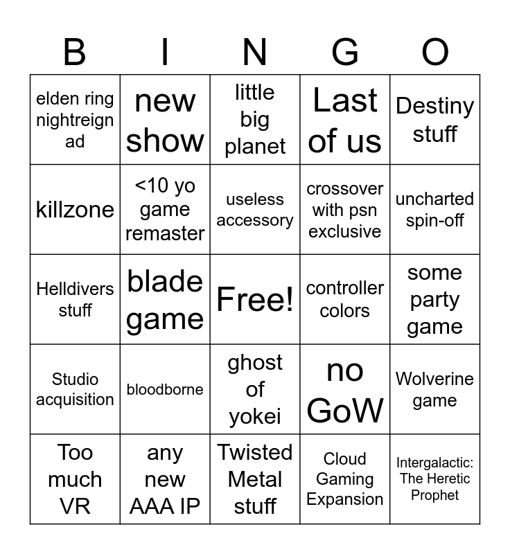 This bingo card has a free space and 24 words: bloodborne, any new AAA IP, useless accessory, Too much VR, Destiny stuff, elden ring nightreign ad, killzone, new show, controller colors, ghost of yokei, crossover with psn exclusive, Helldivers stuff, no GoW, Wolverine game, <10 yo game remaster, Cloud Gaming Expansion, some party game, little big planet, uncharted spin-off, blade game, Intergalactic: The Heretic Prophet, Studio acquisition, Last of us and Twisted Metal stuff.