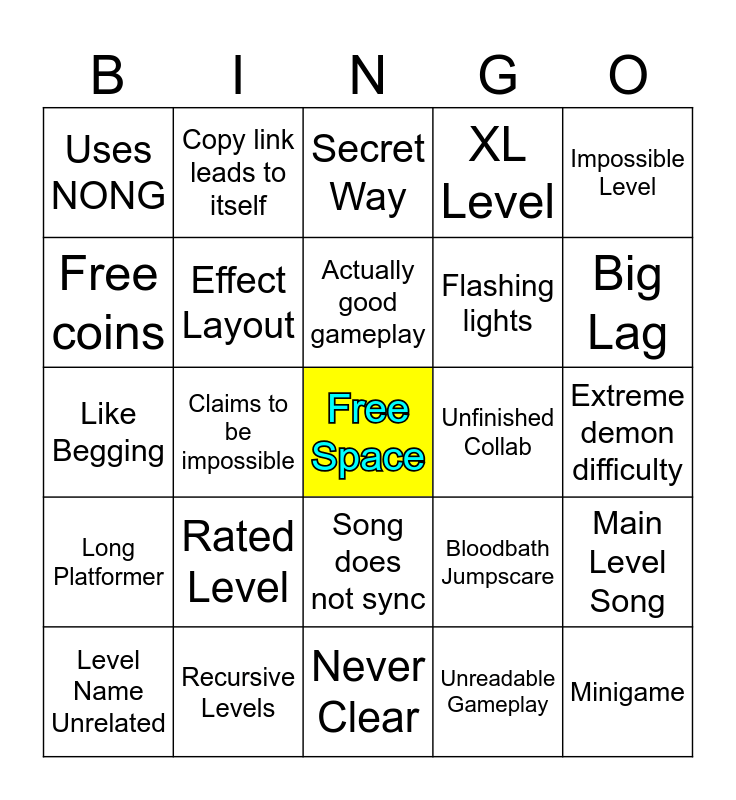 This bingo card has a free space and 64 words: Triple Spike, Auto, Noclip Level, Main Level Song, Copy of popular level, Copy link leads to nowhere, Copy link leads to itself, "Make your own" level, Actually good gameplay, Actually good decoration, Song does not sync, Incorrect grammar, Extreme demon difficulty, Impossible Level, Good sync, Free coins, Claims to be impossible, Uses NONG, High object count, Flashing lights, Rated Level, Long Platformer, XL Level, Cool Gimmick, Bug Showcase, Puzzle Platformer, Level Remake, Funny Level, Contains Startpos, Uses Popular song, Bad Song, Good Song, Unknown Song, Has Potential, Big Lag, Level Name Unrelated, Move Trigger Abuse, Unreadable Gameplay, Congregation Jumpscare, Effect Layout, Like Begging, Unfinished Collab, Finished Collab, Level contains Insult, Dash Spider Jumpscare, Minigame, Recursive Levels, Effect Abuse, Bloodbath Jumpscare, Challenge For Someone Else, Low Object Challenge, steechy Challenge, Never Clear, Layout, Nine Circles, Less than 8 digit ID, Secret Way, 1.0 Style, Unique Deco, Unique Gameplay, Youtube Shorts ahh Level, Unbalanced Gameplay, Unbalanced Decoration and Stacked Portals.