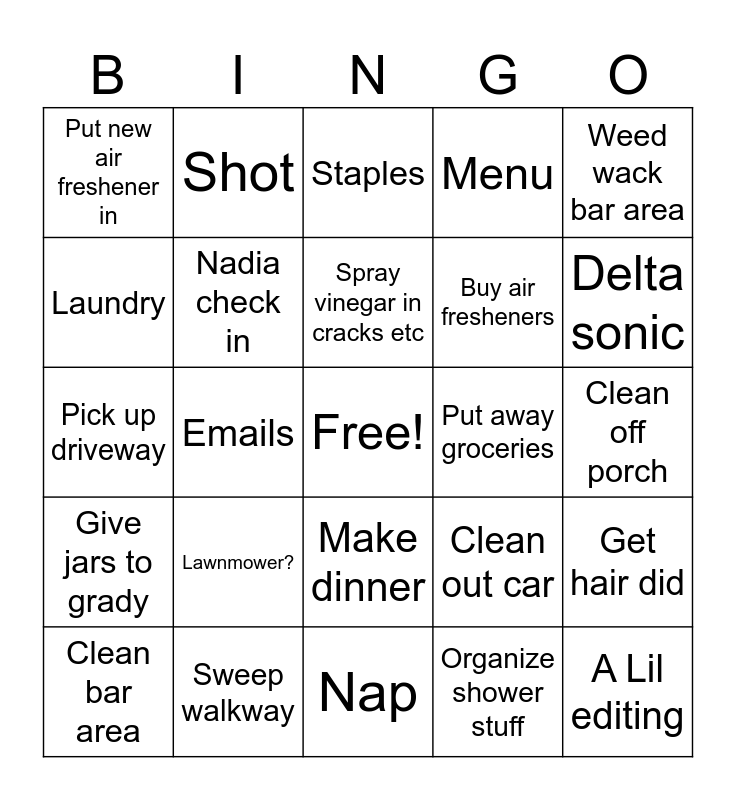 This bingo card has a free space and 24 words: Lawnmower?, Sweep walkway, Spray vinegar in cracks etc, Clean bar area, Weed wack bar area, Put new air freshener in, Laundry, Shot, Put away groceries, Make dinner, Buy air fresheners, Pick up driveway, Clean out car, Get hair did, Nadia check in, Organize shower stuff, Clean off porch, Staples, Delta sonic, Emails, A Lil editing, Give jars to grady, Menu and Nap.