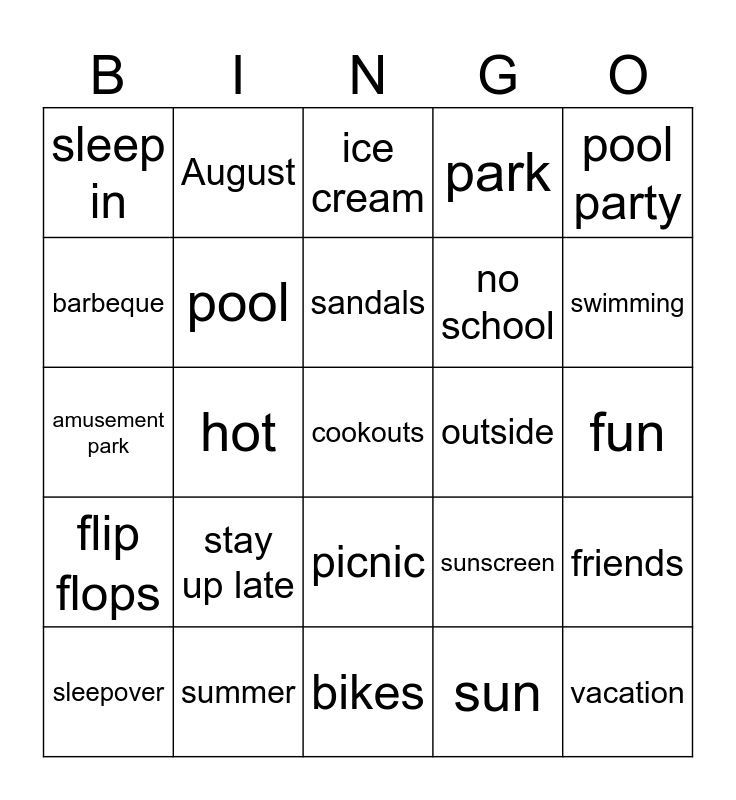 This bingo card has 30 words: summer, beach, hot, travel, sleep in, ice cream, pool, picnic, outside, bikes, fun, cookouts, sun, vacation, swimming, watermelon, sunscreen, flip flops, stay up late, pool party, amusement park, July, August, no school, barbeque, park, friends, sleepover, sandals and waterpark.