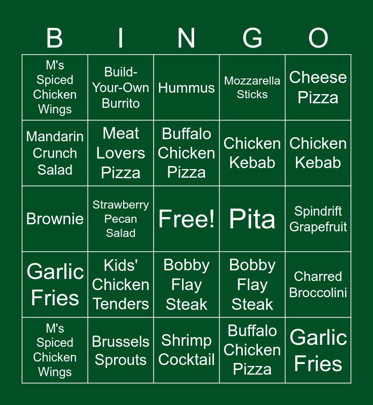 This bingo card has a free space and 54 words: Mandarin Crunch Salad, Strawberry Pecan Salad, Cobb Salad, Classic Brisket Sandwich, Pork Ribs, Kids' Mac & Cheese, Build-Your-Own Burrito, Chips & Queso, Mozzarella Sticks, Cheese Pizza, M's Spiced Chicken Wings, Meat Lovers Pizza, Buffalo Chicken Pizza, Poppi Strawberry Lemon, Spindrift Grapefruit, Brussels Sprouts, Hummus, Pita, Cheesesteak, Garlic Fries, Kids' Chicken Tenders, Shrimp Cocktail, Bobby Flay Steak, Chicken Kebab, Charred Broccolini, Mandarin Crunch Salad, Strawberry Pecan Salad, Cobb Salad, Classic Brisket Sandwich, Pork Ribs, Kids' Mac & Cheese, Build-Your-Own Burrito, Chips & Queso, Mozzarella Sticks, Cheese Pizza, M's Spiced Chicken Wings, Meat Lovers Pizza, Buffalo Chicken Pizza, Poppi Strawberry Lemon, Spindrift Grapefruit, Brussels Sprouts, Hummus, Pita, Cheesesteak, Garlic Fries, Kids' Chicken Tenders, Shrimp Cocktail, Bobby Flay Steak, Chicken Kebab, Charred Broccolini, Brownie, Banana Pudding, Lemon Chess Pie and Strawberry Swirl Cheesecake.