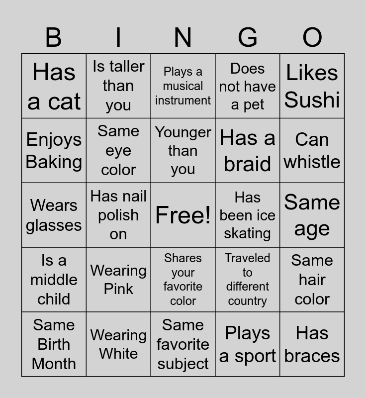 This bingo card has a free space and 24 words: Wearing Pink, Wearing White, Younger than you, Same Birth Month, Likes Sushi, Has a cat, Enjoys Baking, Is taller than you, Has been ice skating, Shares your favorite color, Has a braid, Wears glasses, Traveled to different country, Same hair color, Same eye color, Plays a sport, Same age, Plays a musical instrument, Can whistle, Has nail polish on, Has braces, Is a middle child, Does not have a pet and Same favorite subject.