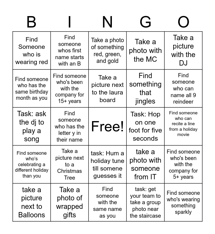 This bingo card has a free space and 24 words: Take a picture next to a Christmas Tree, Take a photo of wrapped gifts, Take a picture next to the laura board, take a picture next to Balloons, Take a picture with the DJ, Find Someone who is wearing red, Find someone who has the same birthday month as you, Find someone whos first name starts with an B, Task: Hop on one foot for five seconds, task: Hum a holiday tune till somene guesses it, Find something that jingles, Task: ask the dj to play a song, take a photo with someone from IT, Find someone who's been with the company for 5+ years, Find someone who's been with the company for 15+ years, task: get your team to take a group photo near the staircase, Find someone who can recite a line from a holiday movie, Take a photo of something red, green, and gold, Find someone who can name all 9 reindeer, Find someone who has the letter y in their name, Find someone who's wearing something sparkly, Find someone who’s celebrating a different holiday than you, Take a photo with the MC and Find someone with the same name as you.