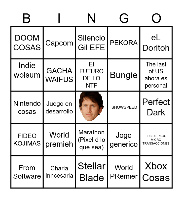 This bingo card has a free space and 24 words: World premieh, Charla Inncesaria, El FUTURO DE LO NTF, From Software, eL Doritoh, DOOM COSAS, Indie wolsum, Capcom, ISHOWSPEED, Marathon (Pixel d lo que sea), Bungie, Nintendo cosas, Jogo generico, FPS DE PAGO MICRO TRANSACCIONES, GACHA WAIFUS, World PRemier, Perfect Dark, Silencio Gil EFE, The last of US ahora es personal, Juego en desarrollo, Xbox Cosas, FIDEO KOJIMAS, PEKORA and Stellar Blade.
