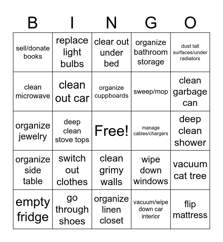This bingo card has a free space and 24 words: switch out clothes, go through shoes, organize cuppboards, empty fridge, dust tall surfaces/under radiators, sell/donate books, clean microwave, replace light bulbs, manage cables/chargers, clean grimy walls, sweep/mop, organize jewelry, wipe down windows, vacuum cat tree, clean out car, vacuum/wipe down car interior, deep clean shower, clear out under bed, clean garbage can, deep clean stove tops, flip mattress, organize side table, organize bathroom storage and organize linen closet.
