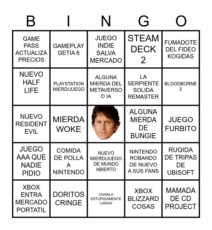 This bingo card has a free space and 24 words: COMIDA DE POLLA A NINTENDO, DORITOS CRINGE, ALGUNA MIERDA DEL METAVERSO O IA, XBOX ENTRA MERCADO PORTATIL, FUMADOTE DEL FIDEO KOGIDAS, GAME PASS ACTUALIZA PRECIOS, NUEVO HALF LIFE, GAMEPLAY GETIA 6, ALGUNA MIERDA DE BUNGIE, NUEVO MIERDIJUEGO DE MUNDO ABIERTO, LA SERPIENTE SOLIDA REMASTER, NUEVO RESIDENT EVIL, NINTENDO ROBANDO DE NUEVO A SUS FANS, RUGIDA DE TRIPAS DE UBISOFT, PLAYSTATION MIERDIJUEGO, XBOX BLIZZARD COSAS, JUEGO FURBITO, JUEGO INDIE SALVA MERCADO, BLOODBORNE 2, MIERDA WOKE, MAMADA DE CD PROJECT, JUEGO AAA QUE NADIE PIDIO, STEAM DECK 2 and CHARLA ESTUPIDAMENTE LARGA.