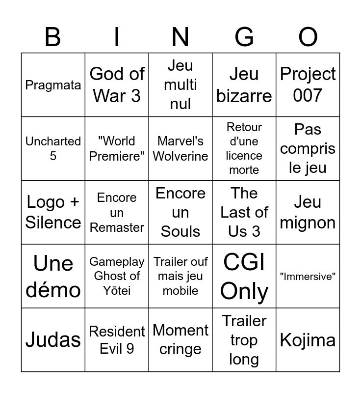 This bingo card has a free space and 24 words: Gameplay Ghost of Yōtei, Resident Evil 9, Marvel's Wolverine, Judas, Project 007, Pragmata, Uncharted 5, God of War 3, The Last of Us 3, Trailer ouf mais jeu mobile, Retour d'une licence morte, Logo + Silence, CGI Only, "Immersive", "World Premiere", Trailer trop long, Jeu mignon, Jeu multi nul, Pas compris le jeu, Encore un Remaster, Kojima, Une démo, Jeu bizarre and Moment cringe.