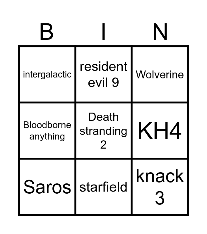This bingo card has a free space and 8 words: KH4, Wolverine, resident evil 9, Saros, intergalactic, knack 3, Bloodborne anything and starfield.