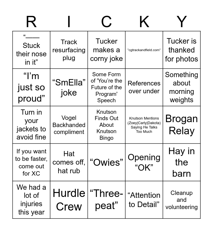 This bingo card has a free space and 32 words: “Attention to Detail”, Carter Glaze over 5 minute, Vogel Backhanded compliment, Knutson Cries, If you want to be faster, come out for XC, “SmElla” joke, Tucker is thanked for photos, Hay in the barn, Track resurfacing plug, Performance in bad conditions (weather), Some Form of 'You’re the Future of the Program' Speech, Tucker makes a corny joke, How close the district meet is, Mental Toolbox, Knutson Mentions (Zoey|Carly|Dakota) Saying He Talks Too Much, Student comes first in student-athlete, We had a lot of injuries this year, Turn in your jackets to avoid fine, “Owies”, Hat comes off, hat rub, Opening “OK”, We have the hardest league, Brogan Relay, Hurdle Crew, Cleanup and volunteering, “cgtrackandfield.com”, References over under, “I’m just so proud”, “——Stuck their nose in it”, “Three-peat”, Ella’s injury and how she came back and Something about morning weights.