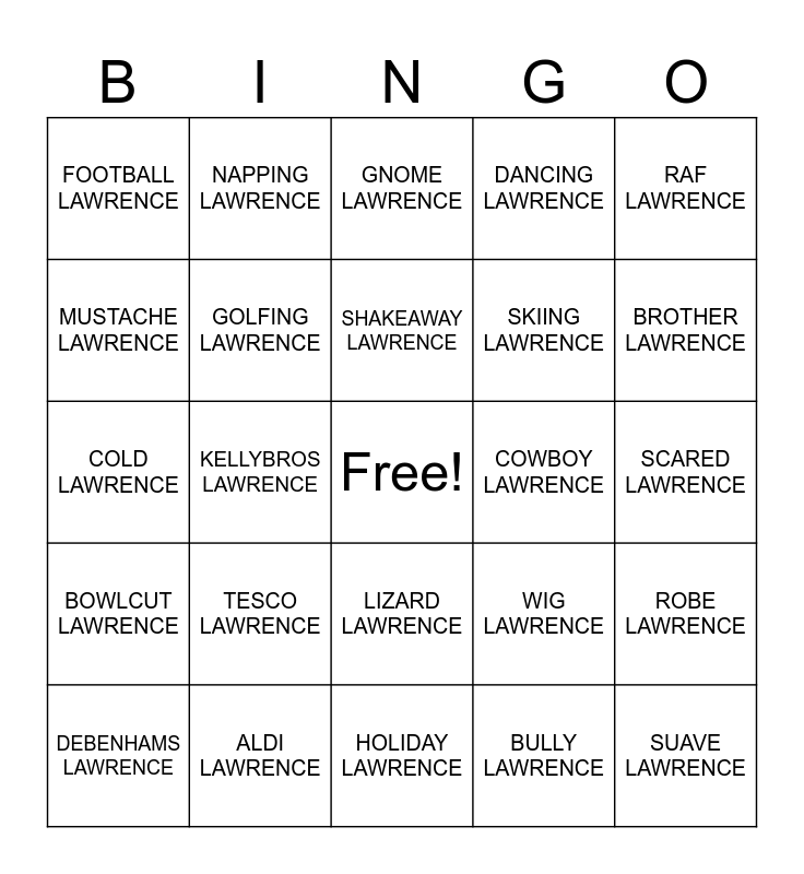 This bingo card has a free space and 24 words: TESCO LAWRENCE, ALDI LAWRENCE, SHAKEAWAY LAWRENCE, DEBENHAMS LAWRENCE, RAF LAWRENCE, FOOTBALL LAWRENCE, MUSTACHE LAWRENCE, NAPPING LAWRENCE, COWBOY LAWRENCE, LIZARD LAWRENCE, SKIING LAWRENCE, COLD LAWRENCE, WIG LAWRENCE, ROBE LAWRENCE, GOLFING LAWRENCE, BULLY LAWRENCE, SCARED LAWRENCE, GNOME LAWRENCE, BROTHER LAWRENCE, KELLYBROS LAWRENCE, SUAVE LAWRENCE, BOWLCUT LAWRENCE, DANCING LAWRENCE and HOLIDAY LAWRENCE.