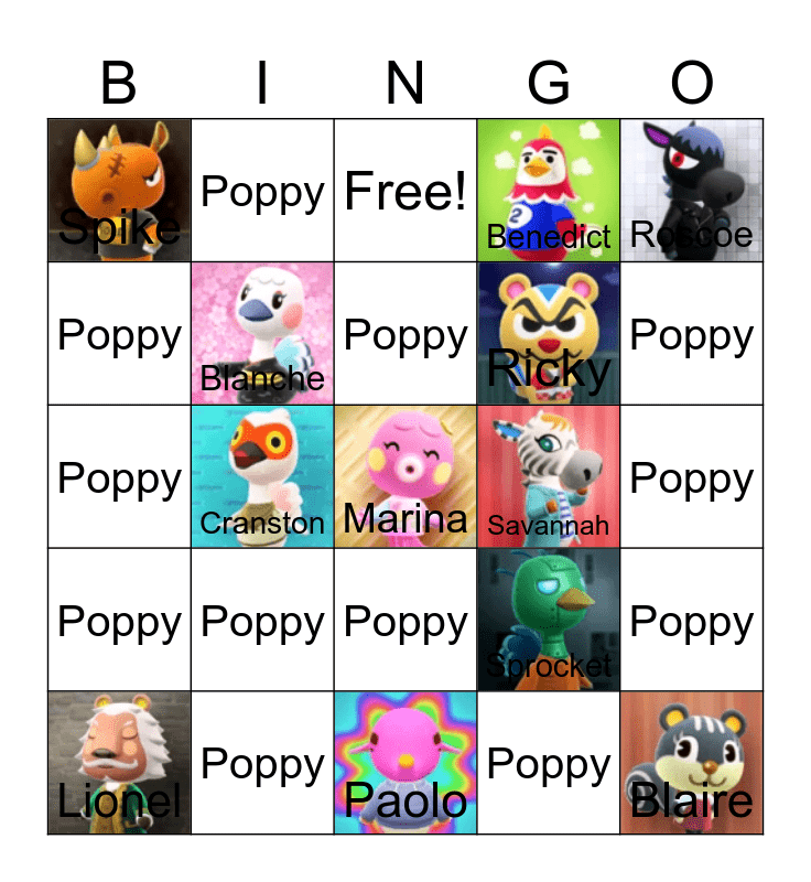 This bingo card has 23 images, a free space and 55 words: Poppy, Lionel, Lolly, Spike, Paolo, Dobie, Blanche, Gala, Ricky, Punchy, Benedict, Olaf, Flora, Tex, Monique, Penelope, Roscoe, Cranston, Baabara, Blaire, Savannah, Doc, Sprocket, Free!, Poppy, Poppy, Poppy, Poppy, Poppy, Poppy, Poppy, Poppy, Poppy, Poppy, Poppy, Poppy, Poppy, Poppy, Poppy, Poppy, Poppy, Poppy, Poppy, Poppy, Poppy, Poppy, Poppy, Poppy, Poppy, Poppy, Poppy, Poppy, Poppy, Poppy and Poppy.